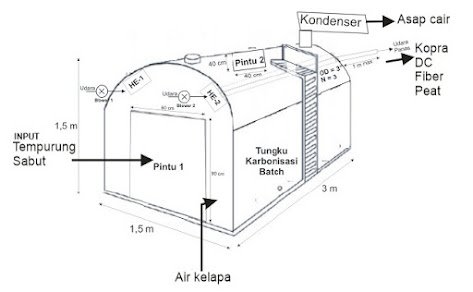 Proses produksi yang tidak efisien akan mendorong terjadinya pemborosan sehingga mengakibatkan biaya produksi tinggi. Energi adalah faktor penting untuk suatu industri khususnya pada industri pengolahan kelapa terpadu. Karbonisasi atau proses pengarangan tempurung kelapa pada umumnya tidak efisien selain juga menghasilkan banyak polusi asap pada proses pengarangan tersebut, untuk lebih detail bisa dibaca disini. Energi yang banyak terbuang tersebut seharusnya bisa dimanfaatkan untuk berbagai pengolahan kelapa, seperti pembuatan kopra putih, dessicated coconut (DC), nata de coco, dan pengeringan cocofiber ataupun cocopeat. Selanjutnya asap yang keluar dari proses karbonisasi tersebut juga bisa dikondensasikan sehingga menghasilkan produk asap cair (liquid smoke). Dengan konfigurasi di atas maka tungku karbonisasi bisa dimanfaatkan seoptimal mungkin demikian juga limbah atau polusi asap juga bisa diminimalisir sekecil mungkin. Skema sederhana tungku karbonisasi seperti dibawah ini :