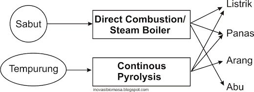 Cara kedua, yakni dengan pirolisis kontinyu. Tempurung kelapa dapat digunakan sebagai sebagai bahan baku pirolisis tersebut. Dengan teknologi pirolisis lebih akan memberi keuntungan karena selain dihasilkan listrik, juga dihasilkan panas dan arang tempurung. Listrik dan panas bisa digunakan untuk operasional industri pengolahan kelapa, sedangkan arang tempurung bisa langsung dijual atau diolah lanjut menjadi briket atau arang aktif (activated carbon). Ketika kebutuhan listrik besar maka pembangkit listrik bisa menggunakan keduanya, yakni steam boiler berbahan bakar sabut kelapa dan pirolisis dengan bahan baku tempurung kelapa. Apabila ingin menghasilkan arang yang lebih banyak maka sabut kelapa juga bisa digunakan untuk bahan bakar pirolisis kontinyu. Kualitas arang sabut kelapa lebih rendah dbandingkan arang dari tempurung kelapa. Hal tersebut sehingga arang sabut kelapa bisa digunakan sebagai arang pertanian (agri-char / biochar) sehingga akan meningkatkan produktivitas kebun kelapa, sedangkan arang tempurung untuk keperluan seperti tersebut di atas.