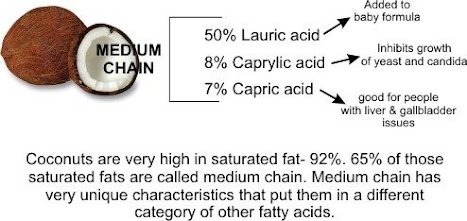 VCO berbeda dengan minyak goreng kelapa karena pada VCO dibuat tanpa pemanasan sehingga menghasilkan asam lemak jenuh rantai sedang atau Medium Chain Fatty Acids (MCFA) yang tinggi, vitamin E, anti oksidan dan enzim-enzim yang ada didalam buah kelapa. Asam laurat dalam VCO mudah diserap sampai ke mitokondria sehingga akan meningkatkan metabolisme tubuh. Asam lemak jenuh, asam laurat (lauric acid) terdiri dari 12 atom karbon, yang diikat jenuh (tidak ada ikatan ganda) oleh atom hidrogen. Hal ini yang membuatnya tidak mudah tengik dan bisa bertahan hingga 2 tahun. Dengan 12 atom karbon tersebut maka asam laurat disebut asam lemak rantai sedang (MCFA). Sedangkan minyak arau asam lemak lainnya pada umumnya seperti minyak goreng sawit, minyak kacang dan sebagainya merupakan asam lemak berantai panjang (long chain fatty acid=LCFA) dan ikatan kimianya tidak jenuh (ikatan ganda). Asam laurat akan diubah menjadi monolaurin atau sebuah senyawa monogliserida yang diproleh para bayi dari air susu ibu yang mempunyai sifat anti virus, anti bakteri, dan anti protozoa.